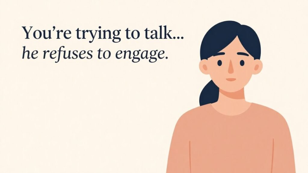He goes silent. He stops responding. He stares at his phone or the TV. He walks away. He says, “I don’t want to talk about this” and refuses to engage. He gives you one-word answers or nothing at all.